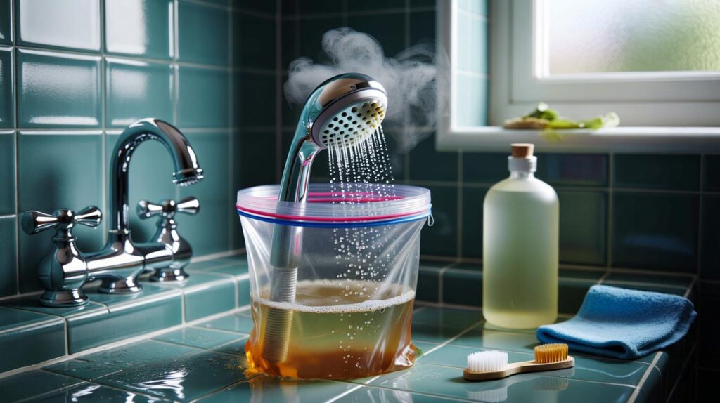 Short on tools or time? Fill a thick plastic bag with warm vinegar and slip it over the head while it stays on the hose or arm. Secure it with an elastic band so the faceplate sits under the liquid. Leave it for 20–40 minutes. Remove the bag, brush the jets, then run the shower hot for a minute. Wipe dry. This quick job before bed keeps morning pressure crisp.
