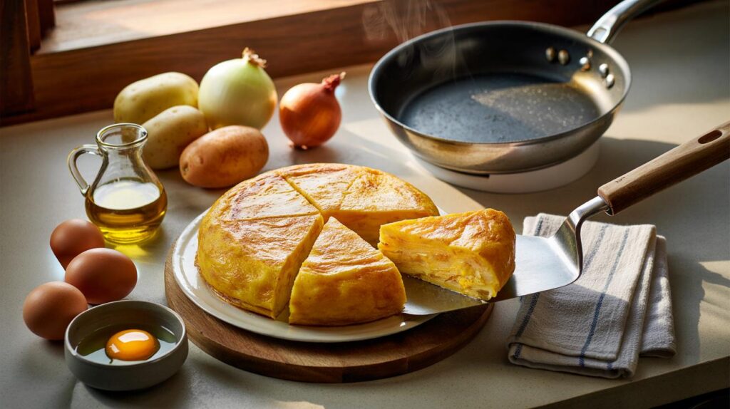 Good tortilla cooks gently. Too fierce a flame toughens the eggs before the middle sets. Medium‑low heat keeps the curds soft and moist. A lid or a large plate traps a little steam, which helps the centre set without drying.